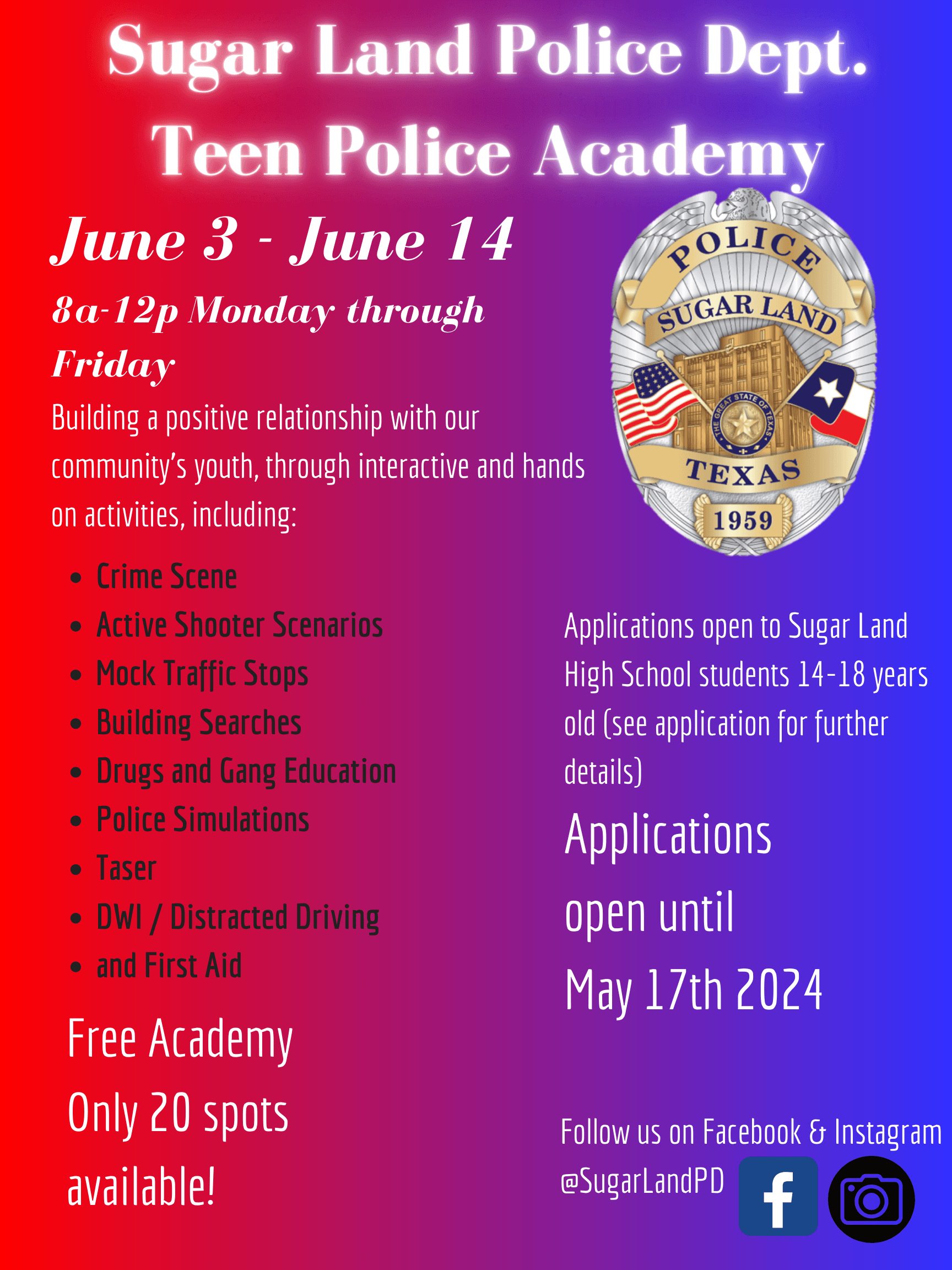 For more information, email volunteer@sugarlandtx.gov.