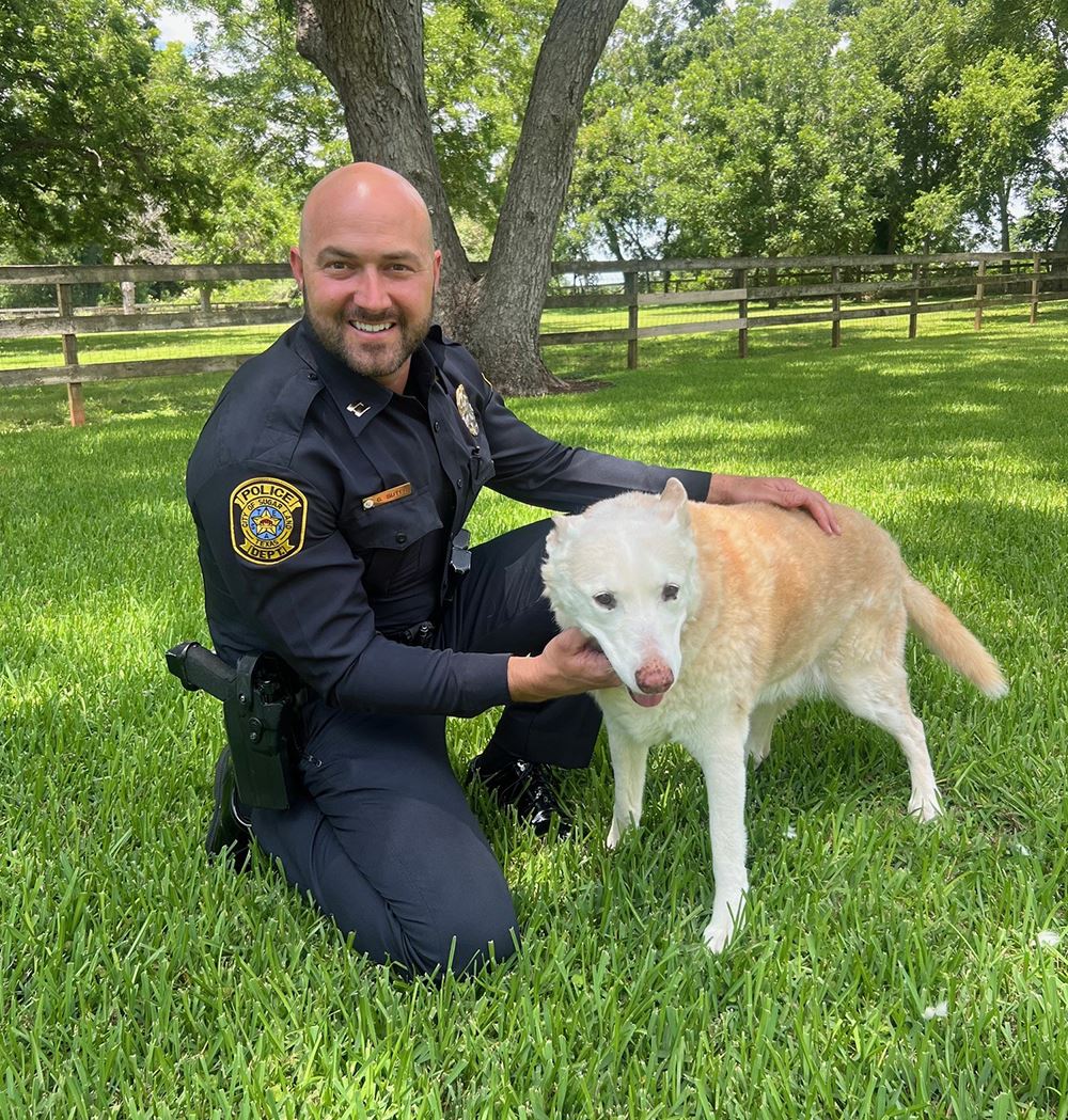 In 2010, Captain Suter was working Patrol when a citizen called the Police Department to report three dogs roaming a parking garage near US 59 and Dairy Ashford.