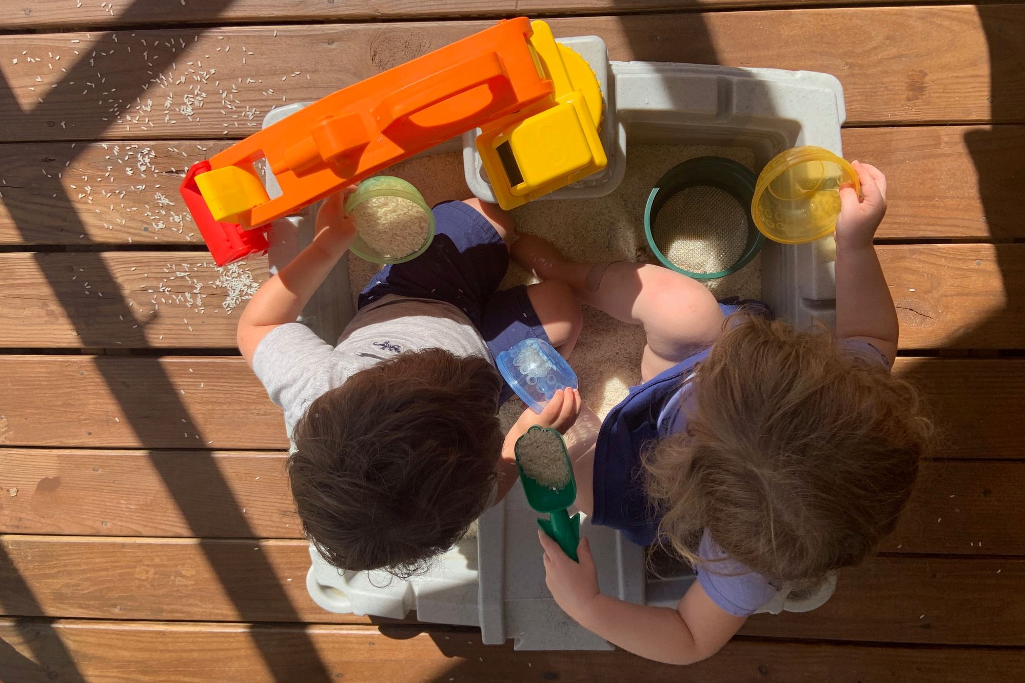 Sensory Sandbox - Great for staying indoors when it’s too hot or rainy! Toddlers and younger children stay entertained for a long time with this fun activity while improving their sensory skills. All you need is a large storage box or empty sandbox, 2-3 large bags of uncooked rice and toy shovels and buckets to get started!